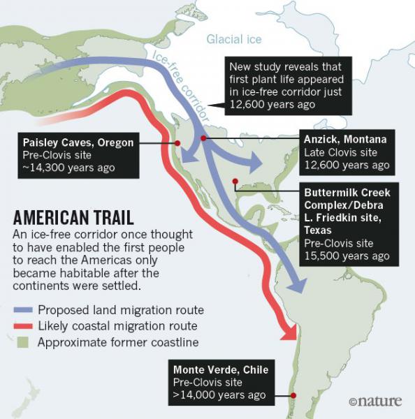 For a long time, the "ice-free corridor", shown above, was the preferred hypothesis for the initial migration south. More recently, a coastal migration route, possibly using canoes, seems more likely. [ Reference ]